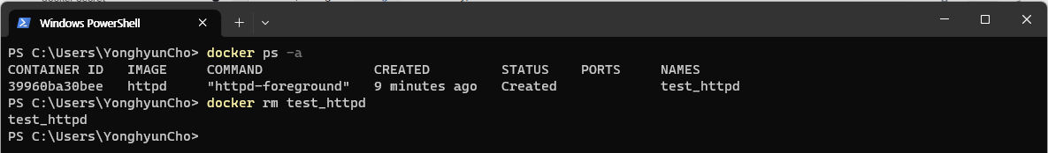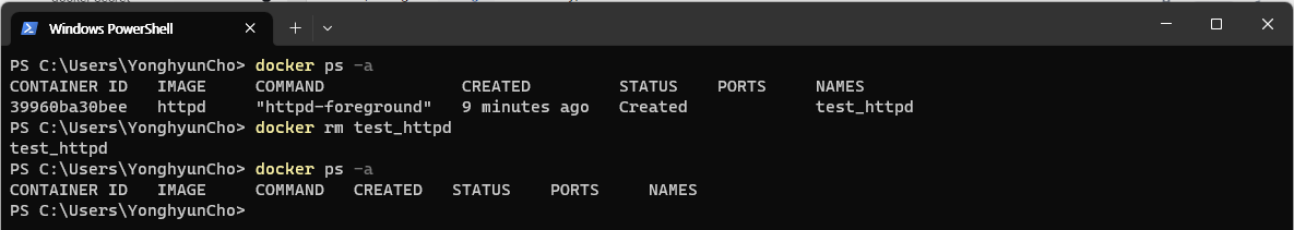 2. 제거할 Container 선택 및 명령 수행 (명령어 : “$ docker rm test_httpd”)