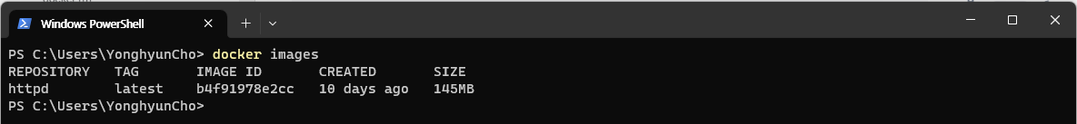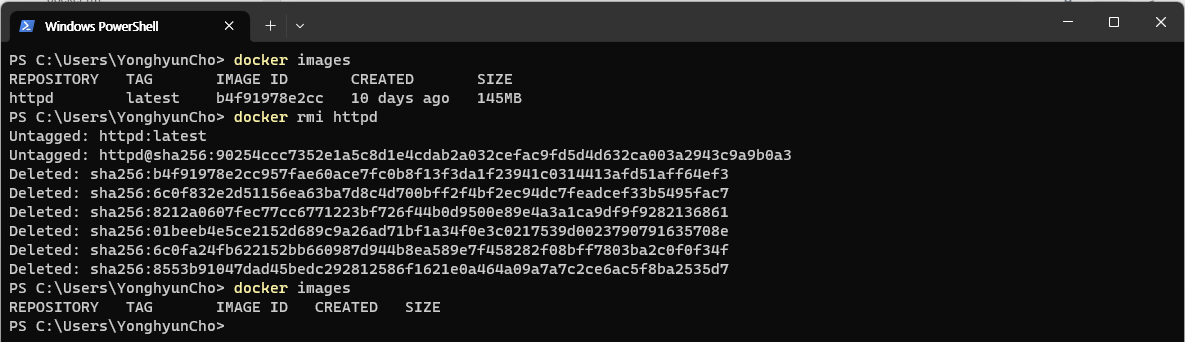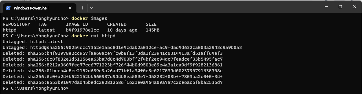 2. 제거할 image 선택 및 명령 수행 (명령어 : “$ docker rmi httpd”)