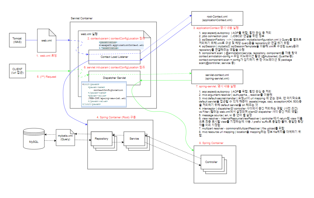 1) web.xml에서 "/" url에 대한 처리를 정의함. ( / ~> spring ~> /WEB-INF/spring-servlet.xml )