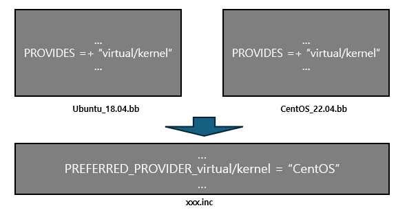 그리고 다중 패키지, 다중 버전을 대응하기 위해 PROVIDES변수에 'virtual/kernel' 과 같이 virtual/ 접두 규칙을 적용시켜줘야하고 PREFERRED_PROVIDER/ PREFERRED_VERSION_<package_name> 변수를 통해 실제 사용할 패키지 혹은 버전을 지정한다..!!