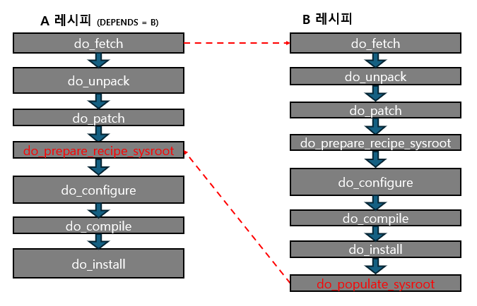 => do_prepare_recipe_sysroot Task가 실행되기 전 의존성이 있는 레시피의 do_populate_sysroot Task가 완료되어야한 다는 뜻이다.